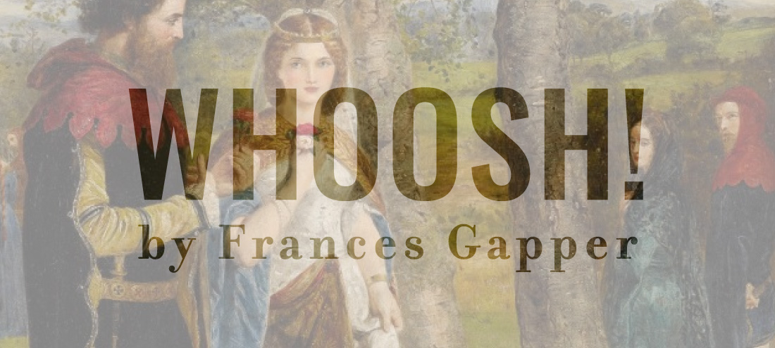 Rooks circle woods, their harsh voices borne to us by the wind. Go, go! But go where? Browsing the royal library, I discover a huge leatherbound volume with GUINEVERE printed in gold on the spine. A book about me! ‘Written long before you were born,’ says Arthur. ‘Don’t even try to decipher its runes.’ I heave the book open, but its pages crumble into fragments, falling in showers of gilded dust. Arthur sighs. ‘Fetch a dustpan and brush.’ However! One of the Future Chroniclers mistakenly adds me to their Signal group (I know, right?) and thence I access bits of insider info, e.g. I’m to be accused of witchcraft and BOUND TO THE STAKE.