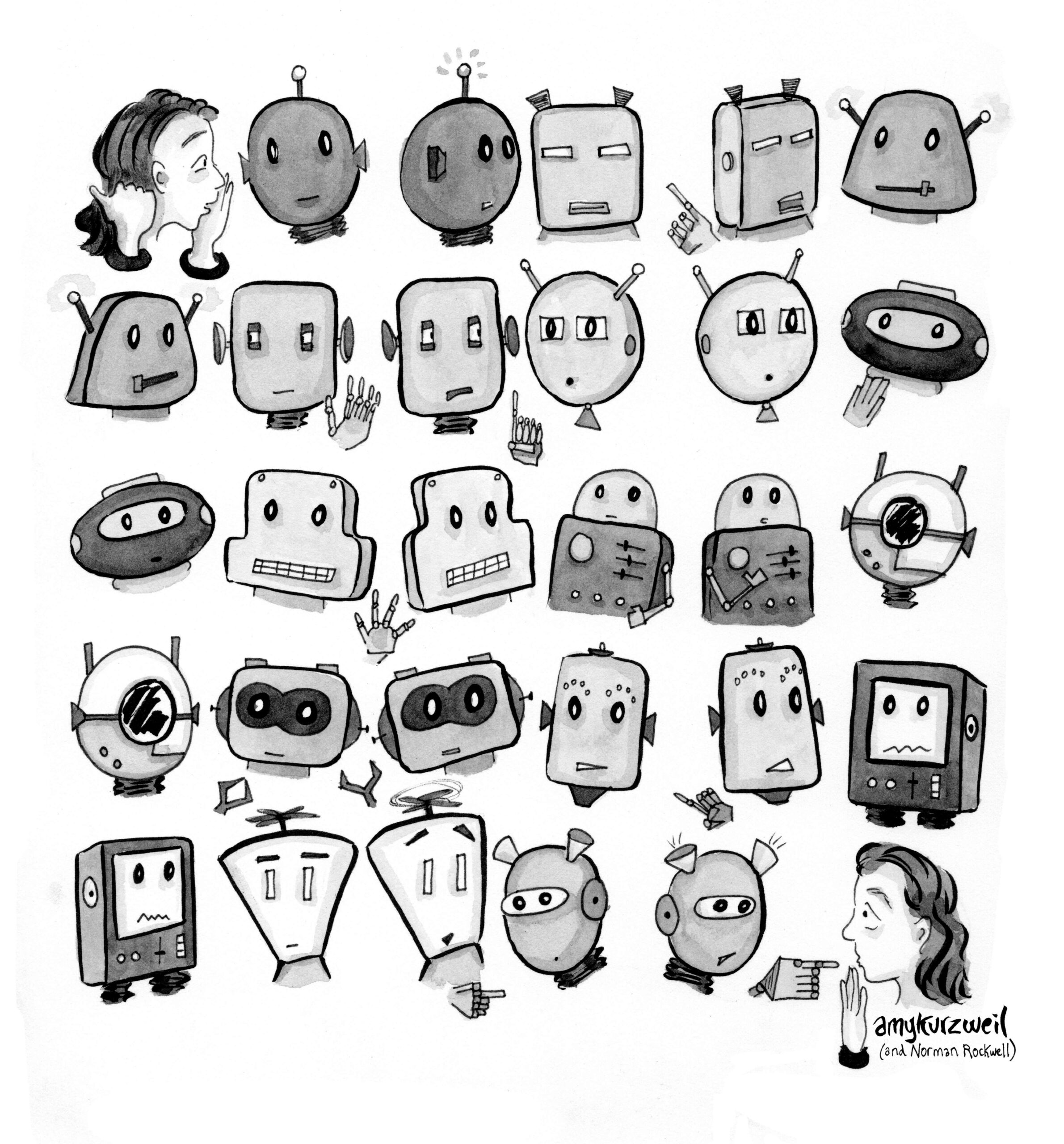 “Stochastic Gossips” is a cover of Norman Rockwell’s classic “The Gossips” and a reference to the “stochastic parrot,” a term, coined by artificial intelligence researcher Emily Bender, that digs at large language models like ChatGPT that parrot language without “understanding” its meaning. But we human gossips don’t engage with LLMs stochastically (i.e. probabilistically); we imbue them with character, voice, maybe even agency. In my cartoons, the robot is a visual metaphor for our projection of human-like qualities onto machines and AI. The figure of the robot in cartoons is funny because we both know and don’t know that robots are not humans. This both/and space is often where humor lies.